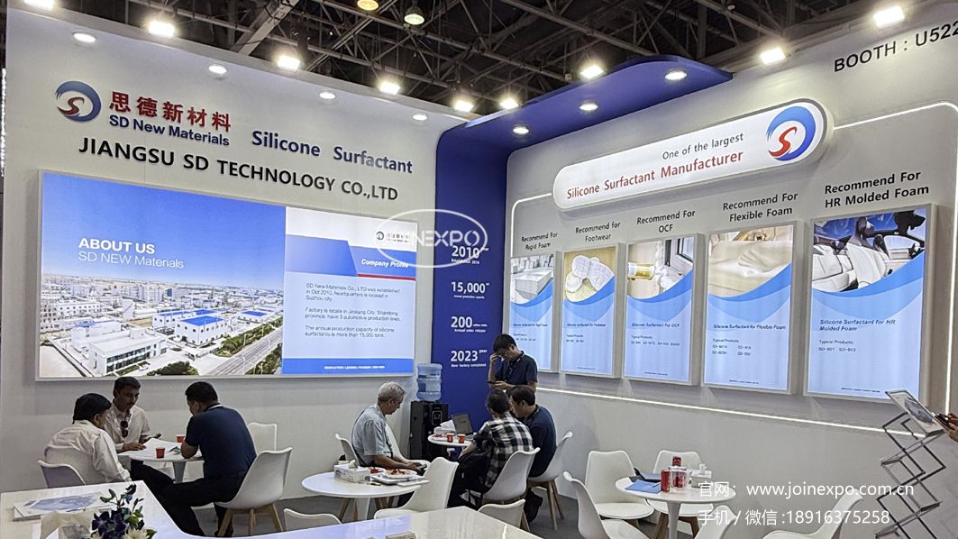 制品展区涵盖聚氨酯泡沫(软/硬)、聚氨酯弹性体、聚氨酯鞋底原液、组合料、聚氨酯革用树脂、聚氨酯弹性纤维(氨纶)、聚氨酯粘合剂、密封胶等多种产品。